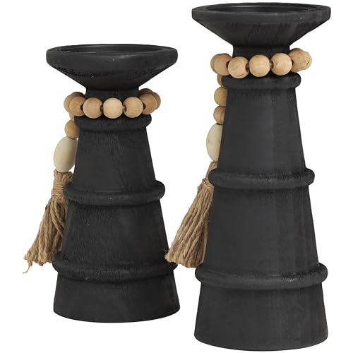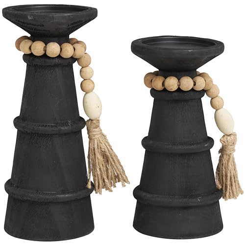 Deco 79 Wood Handmade Decorative Candle Holder Textured Matte Candle Stand with Beaded Garland Accent, Set of 2 Candlestick Holder 10″, 8″ H, Black