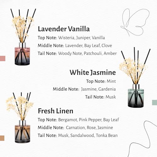 【Reed Diffuser 】: Unique Premium Fresh Linen+White Jasmine+Lavender Vanilla, The three scents are suitable for various environments, giving you different experience feelings. Fresh and elegant atmosphere, the smell of the sun, the smell of the ocean, etc.