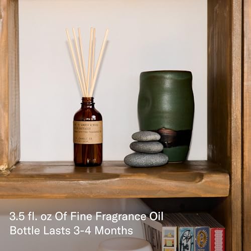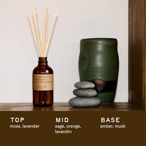 P.F. Candle Co. Amber & Moss Classic Scented Rattan Reed Diffuser (3.5 fl oz) Amber Glass Jar, Fine Fragrance Oil, Flame-Free Fragrance, Made in The U.S.A.