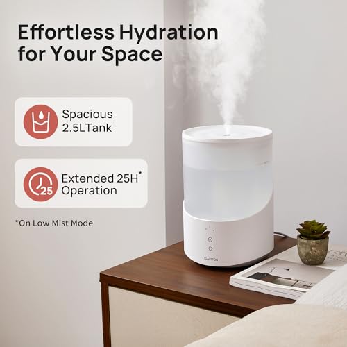 Long-Lasting Hydration & Automatic Shut-Off: Equipped with a 2.5L large tank, this humidifier delivers up to 25 hours of continuous, soothing mist, helping to ease you into a restful sleep while alleviating congestion and dry throat; the automatic shut-off feature ensures safety and peace of mind, turning the device off when water levels are low
